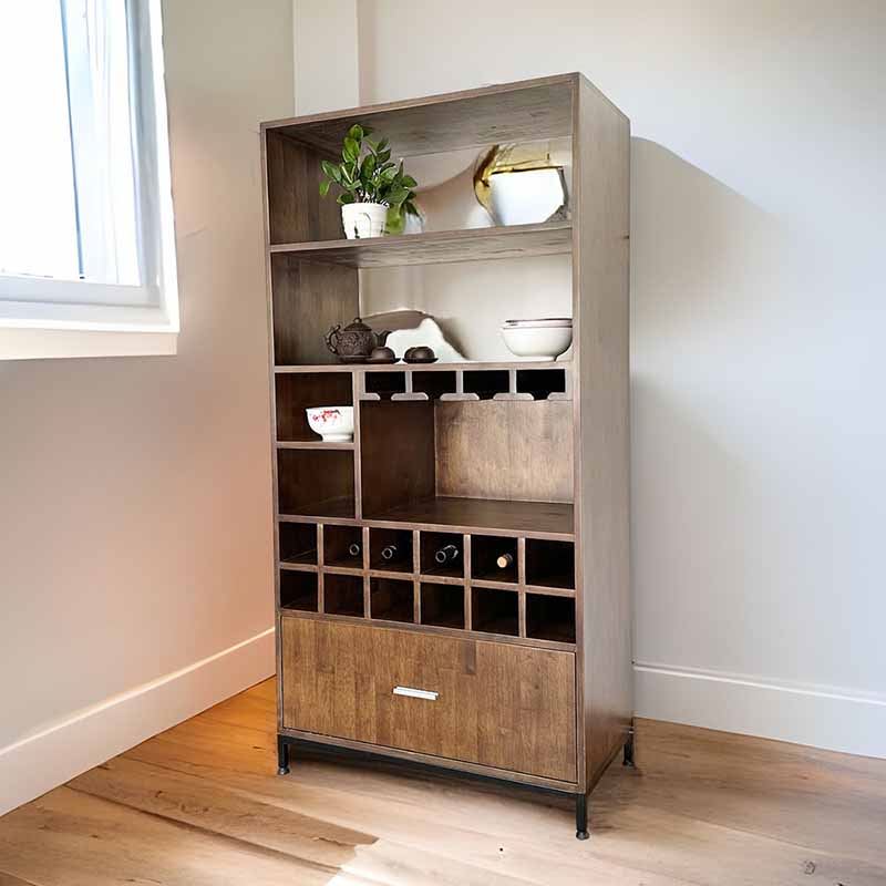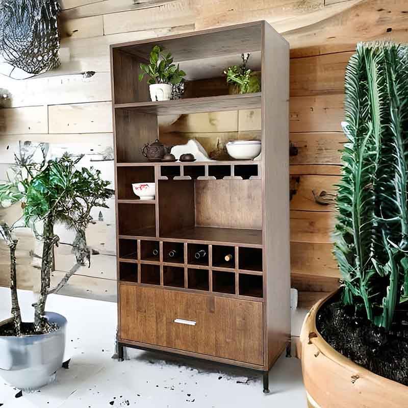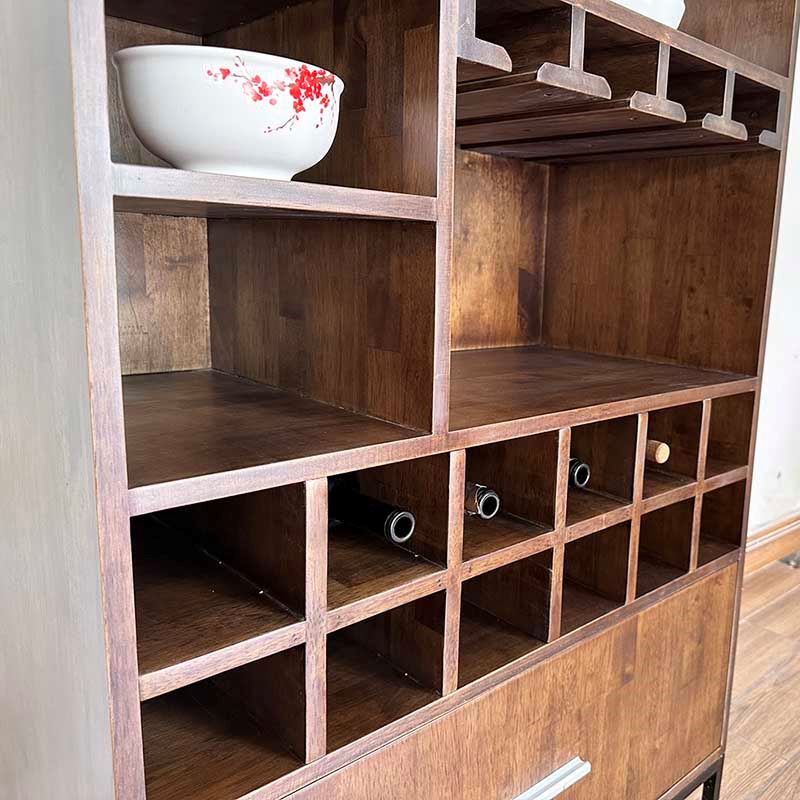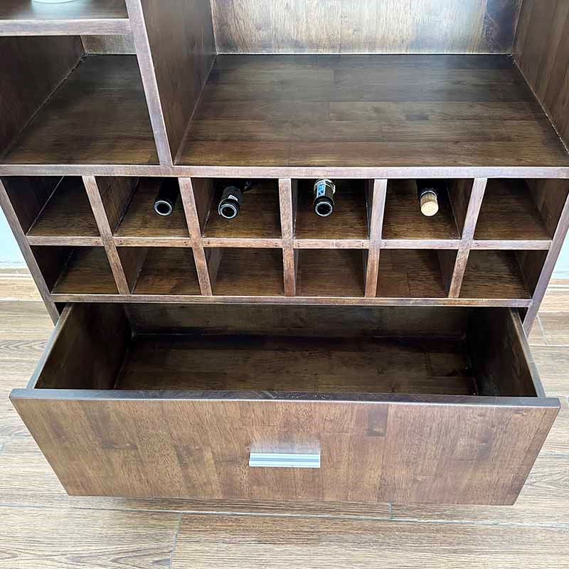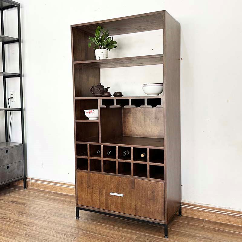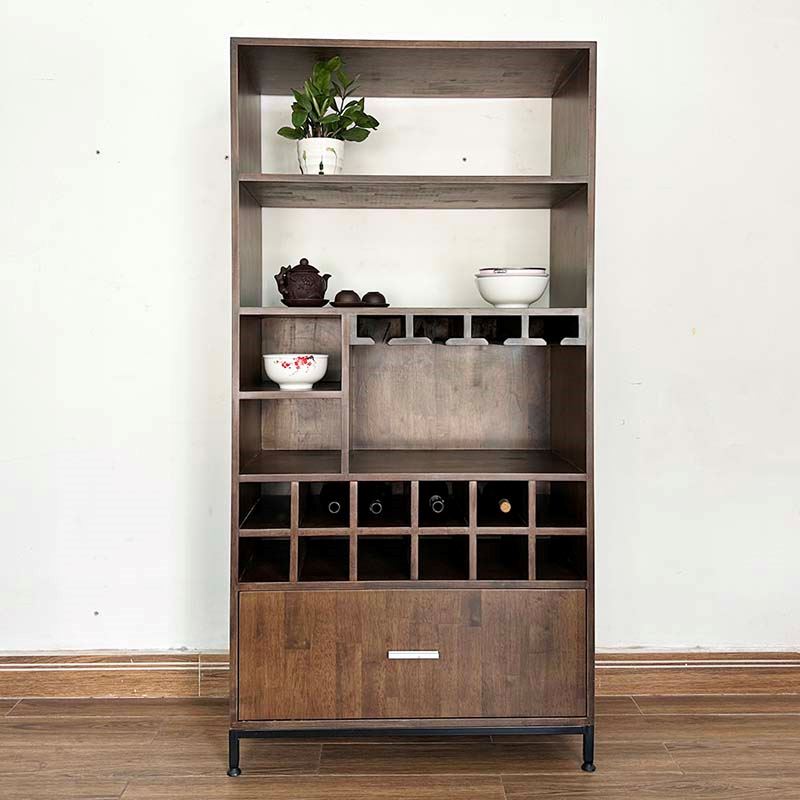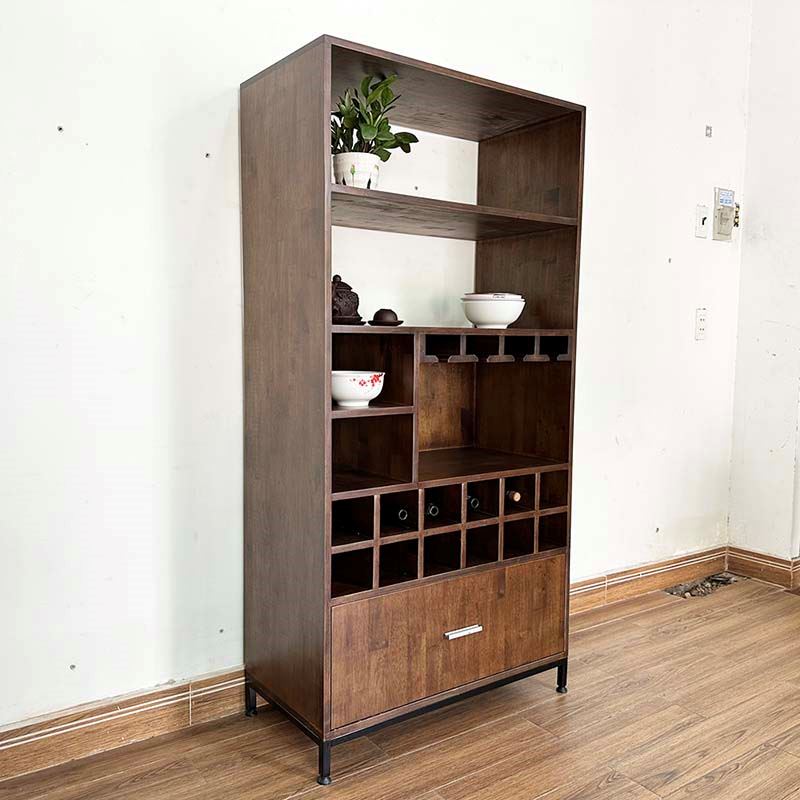 Tủ phòng ăn kết hợp tủ rượu gỗ cao su TPA013 với thiết kế thông minh, chia ngăn tầng hợp lý kết hợp các ngăn đựng rượu và ly giúp bạn lưu trữ hay trưng bày các món đồ của mình một cách dễ dàng hơn, kiểu dáng hiện đại phù hợp với không gian phòng ăn hay nhà bếp nhà ở hay các căn hộ cư hiện nay. Chất liệu chính được sử dụng là gỗ cao su tiêu chuẩn AA được xử lý và hoàn thiện chống thấm nước, chống cong vênh đảm bảo độ bền cao, sơn màu gỗ óc chó hoặc sơn PU 5 màu sắc khác nhau tuỳ vào nhu cầu mỗi người. Đế chân sắt giúp tủ luôn thông thoáng, bề mặt sắt phủ lớp sơn tĩnh điện đảm bảo độ bền cao.